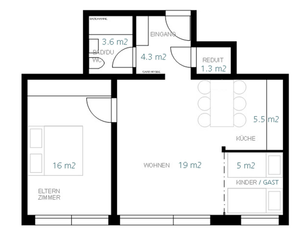 Die attraktive Wohnung liegt im Hochparterre eines Mehrfamilien-hauses neben der Landwasser in Davos Dorf. GrundrissDie gepflegte Wohnung bietet vier Einzelbetten in zwei vom Wohnraum abgetrennten Zimmern (wovon eines abschliessbar mittels Faltwand) .